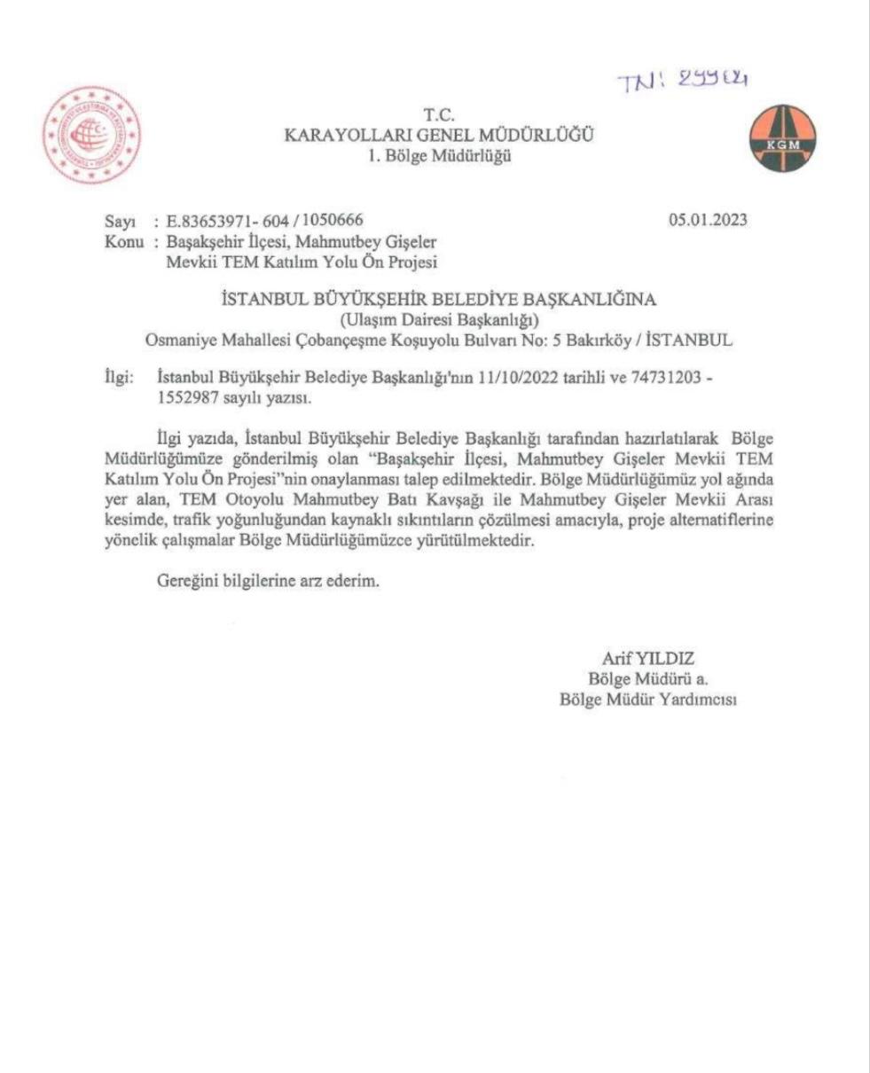 İstanbul Büyükşehir Belediyesi Ulaşım Daire Başkanlığı’nın, sorumluluk alanında olmamasına rağmen TEM Otoyolu Mahmutbey Gişeler mevkiindeki trafik yoğunluğunun önlenmesi için proje hazırladığı, Karayolları Genel Müdürlüğü’nün bölgedeki çalışmayı KGM 1. Bölge Müdürlüğünün yürüteceği yanıtını verdiği ortaya çıktı.