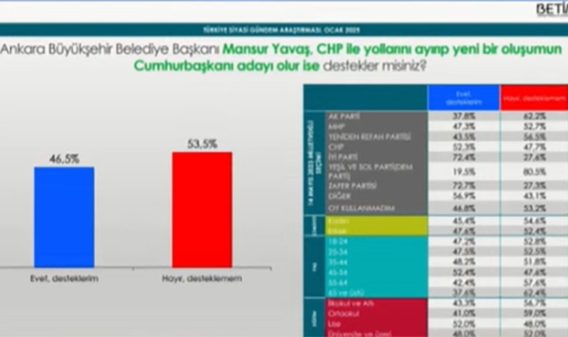 CHP Genel Başkanı Özgür Özel, Türkiye Belediyeler Birliği Başkanı ve İstanbul Büyükşehir Belediye Başkanı Ekrem İmamoğlu ve Ankara Büyükşehir Belediye Başkanı Mansur Yavaş'ın dünkü zirvesinin ardından sürpriz bir ön seçim kararı geldi. Yavaş, üçlü zirvede CHP Genel Başkanı Özgür Özel'e ön seçime katılmayacağını bildirdi.RESTİ ÇEKTİĞİ GÜN ANKET SONUÇLARI GELDİSiyaset gündemine bomba gibi düşen bu gelişmenin yankıları sürerken BETİMAR Araştırma, dikkat çeken bir araştırmanın sonucunu kamuoyu ile paylaştı. Araştırmada katılımcılara "Mansur Yavaş, CHP'den ayrılıp yeni bir oluşumun cumhurbaşkanı adayı olur ise destekler misiniz?" sorusunu yöneltildi.YÜZDE 46'LIK KESİM DESTEKLİYORAraştırmanın sonucuna göre; yüzde 46.5'lik kesim "Evet, destekliyorum" yanıtını verirken, yüzde 53.5'lik kesim ise "Hayır, desteklemiyorum" diyerek Yavaş'ın CHP'den kopmasına karşı çıktı.VERİLEN DESTEĞİN PARTİLERE DAĞILIMIYavaş'ın yeni bir oluşumun adayı olması halinde Zafer Partililerin yüzde 72.7'si, İYİ Partililerin ise yüzde 72.4'ü desteklerim yanıtını verirken bu rakam CHP için yüzde 52.3 oldu. AK Parti'de Yavaş'ı destekleyeceğini belirtenlerin oranı yüzde 37,8 olurken, MHP'lilerin ise yüzde 47,3'ü "desteklerim" yanıtını verdi.NE OLMUŞTU?CHP lideri Özgür Özel, ismi CHP'nin cumhurbaşkanı adayları arasında geçen, İstanbul ve Ankara büyükşehir belediye başkanları, Ekrem İmamoğlu ve Mansur Yavaş'la dün akşam bir araya gelmişti. Erken seçim çağrısı yapan CHP, cumhurbaşkanı adayını da üyelerinin oylarıyla belirleme kararı almıştı. İmamoğlu bu kararı desteklerken; Yavaş, bu adım için erken olduğunu söylemişti.
