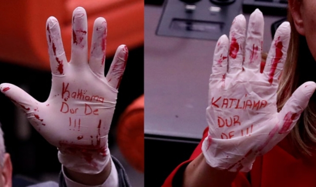 TBMM'de, CHP ve bazı DEM Parti milletvekilleri 'katliam yasasını' üzerinde 'Katliama dur de' yazılı kırmızı boyalı eldivenlerle protesto etti.