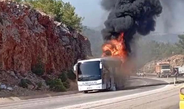 MERSİN'in Aydıncık ilçesinde, seyir halindeyken alev alan yolcu otobüsü kullanılmaz hale geldi. 34 yolcunun bulunduğu otobüsün yanması, kameraya yansıdı. Mersin- Antalya karayolunda seyir halinde olan Alanyalılar Turizm'e ait 07 JC 151 plakalı yolcu otobüsü, iddiaya göre lastiklerinden alev aldı. Durumu fark eden otobüs şoförü Hasan Ö., aracı yolun sağında durdurdu. 34 yolcunun tahliye edildiği otobüs, alev alev yanmaya başladı. İhbar üzerine bölgeye itfaiye ekipleri sevk edildi. İtfaiye ekiplerinin söndürdüğü yangın sonrası otobüs kullanılmaz hale getirdi. Yangın nedeniyle Mersin'den Antalya yönünde yol bir saat trafiğe kapalı kalırken, otobüsün yandığı anlar ise kameraya yansıdı. Polis, yangınla ilgili inceleme başlattı.