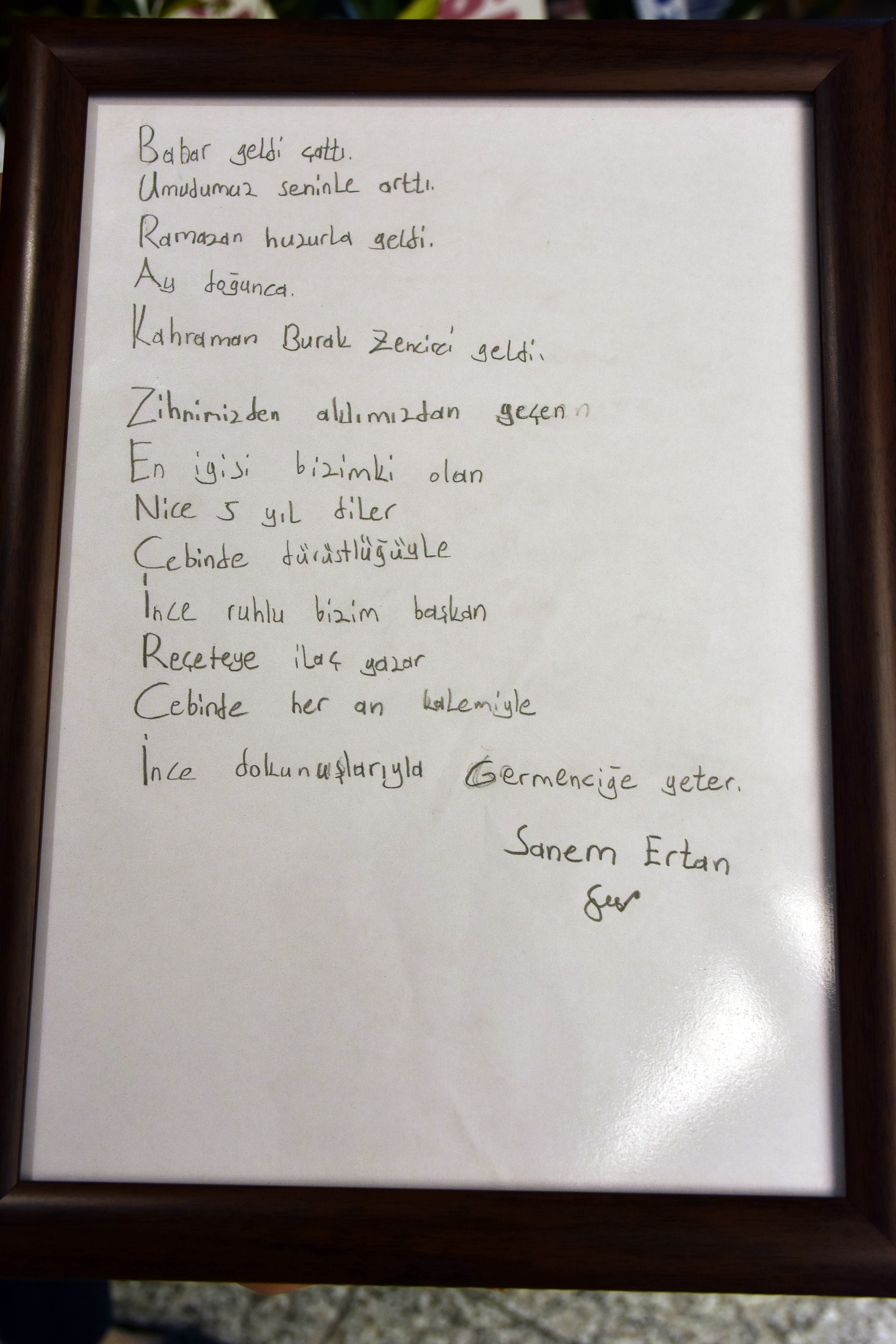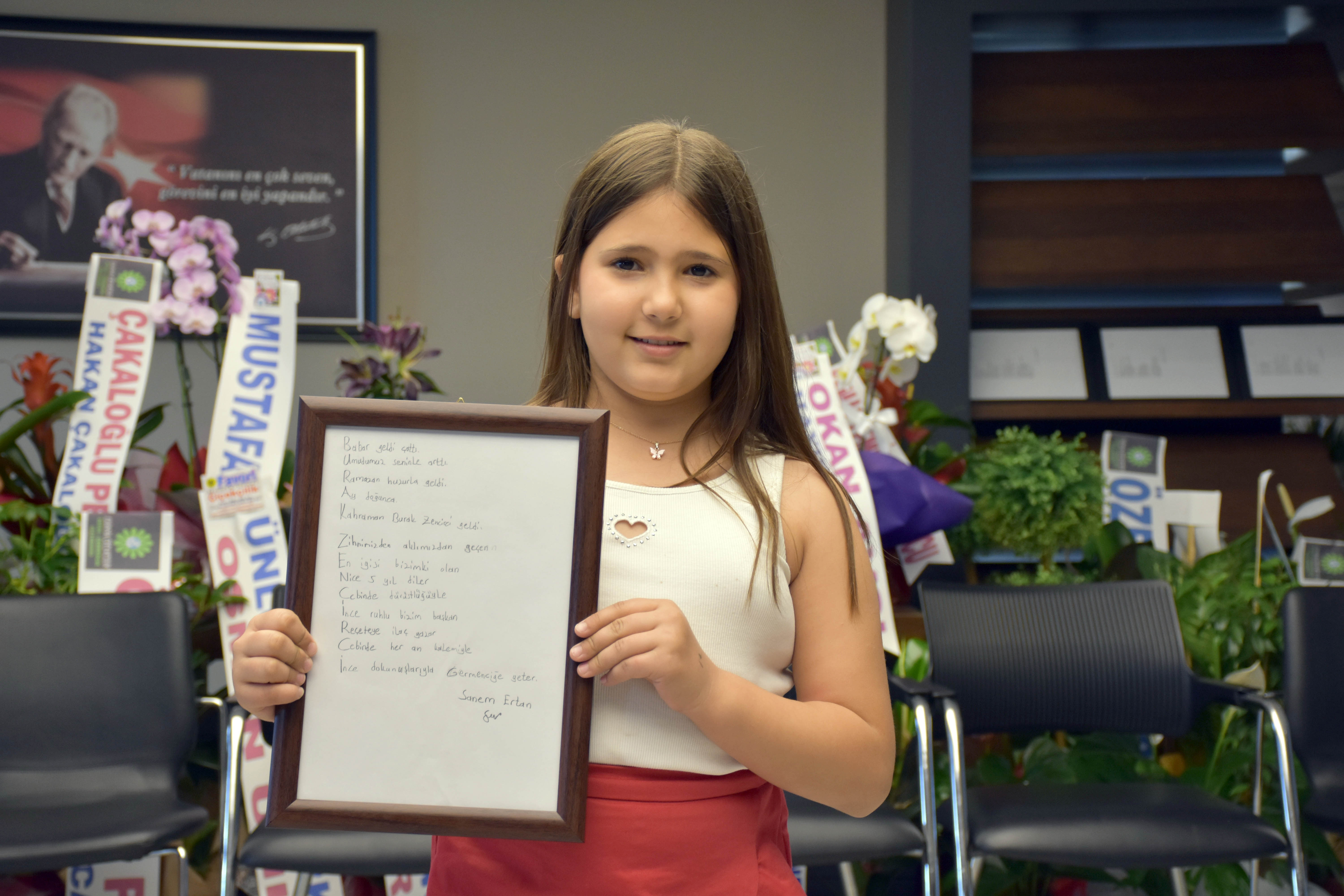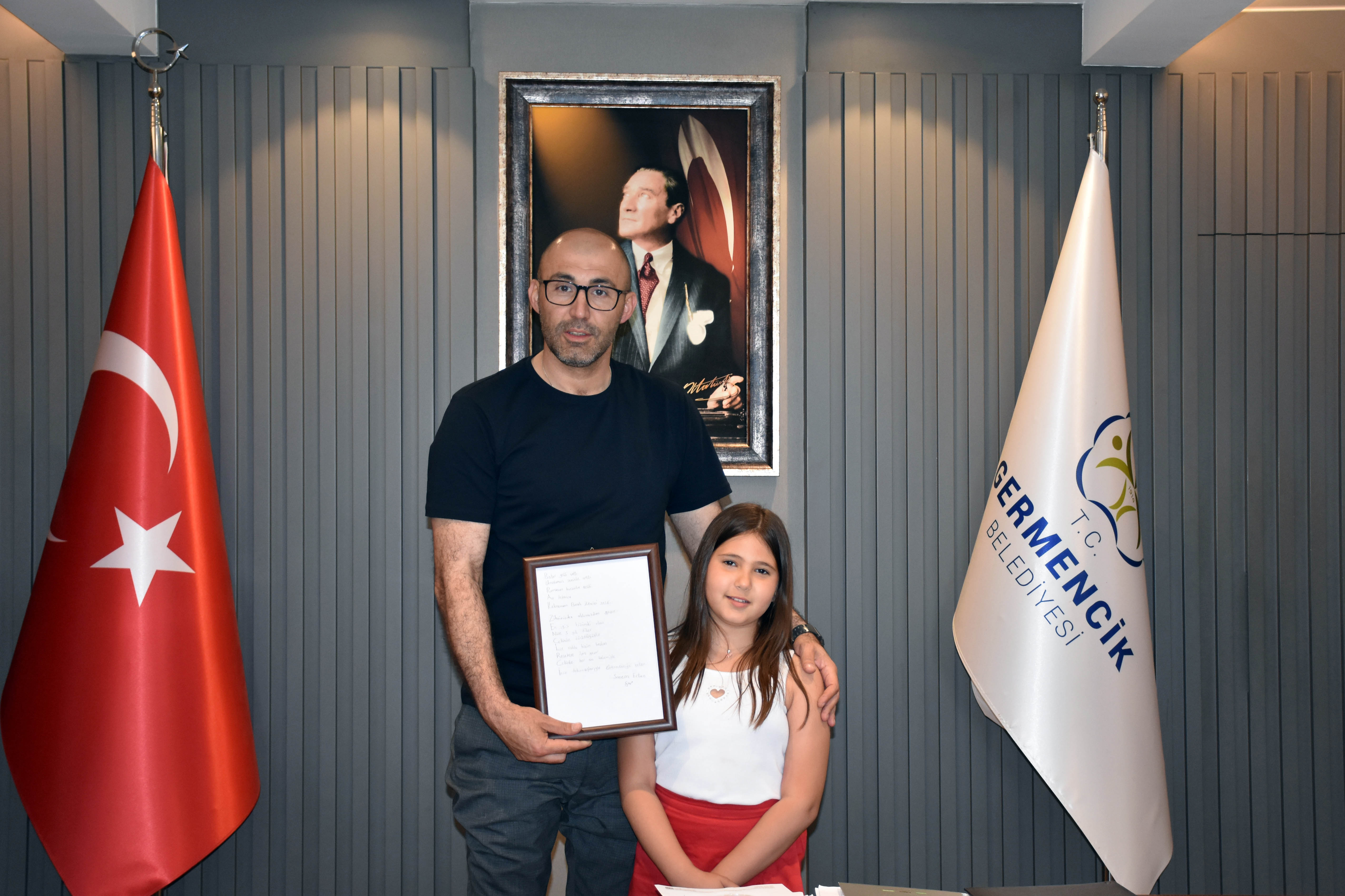 Germencik'te yaşayan 10 yaşındaki Sanem Ertan, Germencik Belediye Başkanı Burak Zencirci için yazdığı akrostiş şiiri hediye etti.Germencik Belediye Başkanı Burak Zencirci, hayırlı olsun ziyaretleri kapsamında 10 yaşındaki Sanem Ertan'ı ağırladı. Minik Sanem, Germencik Belediye Başkanı Burak Zencirci'ye, süpriz yaparak yazmış olduğu isminin baş harflerinden oluşan akrostiş şiiri hediye etti. “YORGUNLUĞUMUZU ALDI”Şiir karşısında duygulanan Başkan Zencirci, Sanem'e teşekkür ederek, “Güzel ve masum yüreğinle kaleme aldığın şiirinle tüm yorgunluğumuzu aldın, bize tarifsiz bir mutluluk yaşattın Sanem. İyi ki varsın, teşekkür ederim.” ifadelerini kullandı.İŞTE O ŞİİRBahar geldi çattı.