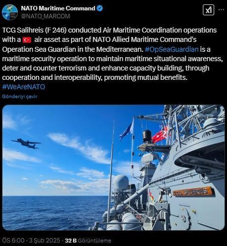 NATO'dan yapılan paylaşımda, şu ifadelere yer verildi:"TCG Salihreis (F 246), NATO Müttefik Deniz Komutanlığı'nın Akdeniz'deki Deniz Muhafızı Harekatı kapsamında Türk hava unsuru ile Hava Deniz Koordinasyon operasyonları gerçekleştirdi. Deniz Güvenliği Operasyonları, birlikte çalışabilirlik yoluyla deniz durum farkındalığını sürdürmek, terörizmi caydırmak ve terörle mücadele etmek ve kapasite oluşturmayı geliştirmek, karşılıklı yararları teşvik etmek için bir deniz güvenlik operasyonudur." Kaynak:Haberler.com