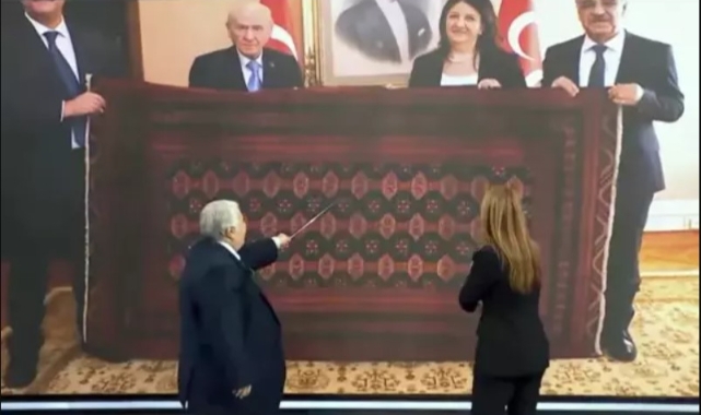Cumhurbaşkanı Erdoğan ve MHP Genel Başkanı Devlet Bahçeli'nin liderliğinde yürütülen Terörsüz Türkiye süreci devam ederken, sürece ilişkin dikkat çeken bir detay kamuoyuna yansıdı. İmralı heyeti aracılığıyla PKK elebaşı Abdullah Öcalan'ın, sürece katkılarından dolayı Devlet Bahçeli'ye bir hediye gönderdiği öğrenildi.ÖCALAN'DAN BAHÇELİ'YE KİLİMDevlet Bahçeli, Abdullah Öcalan'ın Şanlıurfa'da özel olarak dokutturduğu kilimi kendilerine hediye ettiğini açıkladı. Bahçeli, gönderilen armağan için Öcalan'a teşekkürlerini iletti. tv100'den Deniz Gürel ve Başak Şengül'e konuşan Bahçeli, Öcalan'a Türk ve Kürt birliği ile kardeşliği konusundaki samimiyeti nedeniyle teşekkür ettiğini söyledi. Bahçeli, hediye edilen kilime "27 Şubat 2025 Barış ve Demokrasi Kilimi" adını verdiğini de ifade etti.KİLİMDEKİ SEMBOLLER YORUMLANDItv100 yayınında konuyu değerlendiren isimler, kilimde yer alan motiflere dikkat çekti. Eski Ekonomi Bakanı ve Demokratik Sol Parti eski Genel Başkanı Masum Türker, kilimde kurt imajının görüldüğünü söyledi.İşte canlı yayındaki o diyalog;Masum Türker: Bunlar uzaktan bakınca kurt imajı veriyor.Çağlar Cilara: Uzaktan bakınca üst taraftaki figürler kurdu andırıyor.Masum Türker: Şunlar da insanların beraberliğini, birliğini gösteriyor.Başak Şengül: Kilimler konuşur dimi?Kaynak: Haberlercom