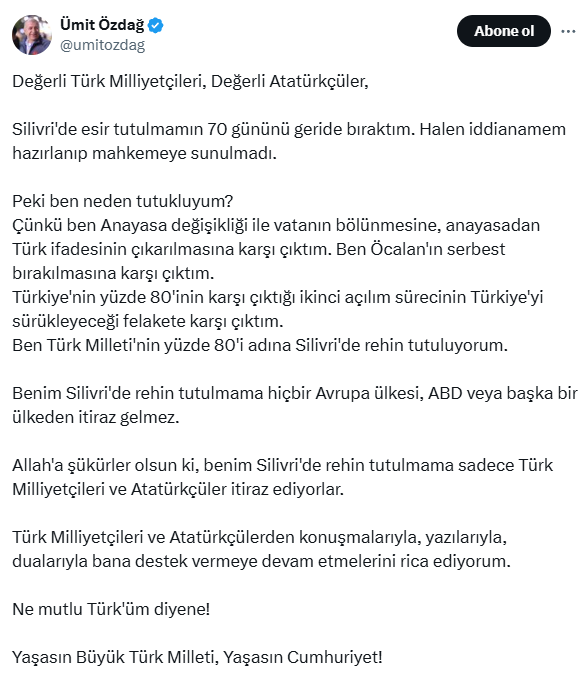Öte yandan X hesabından açıklama yapan Zafer Partisi Genel Başkanı Ümit Özdağ ise "Değerli Türk Milliyetçileri, Değerli Atatürkçüler, Silivri'de esir tutulmamın 70 gününü geride bıraktım. Halen iddianamem hazırlanıp mahkemeye sunulmadı. Peki ben neden tutukluyum?"TÜRK MİLLETİ'NİN YÜZDE 80'İ ADINA SİLİVRİ'DE REHİN TUTULUYORUM"