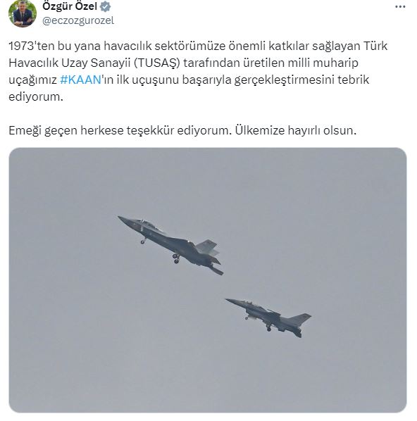 CHP lideri Özel, yaptığı paylaşımda "1973'ten bu yana havacılık sektörümüze önemli katkılar sağlayan Türk Havacılık Uzay Sanayii (TUSAŞ) tarafından üretilen milli muharip uçağımız KAAN'ın ilk uçuşunu başarıyla gerçekleştirmesini tebrik ediyorum. Emeği geçen herkese teşekkür ediyorum. Ülkemize hayırlı olsun" ifadelerine yer verdi.