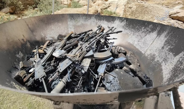 Servis edilen görüntülerde teröristlerin bıraktığı onlarca silahın içinde mazot ve odunların bulunduğu kazanda küle döndüğü görüldü.SEMBOLİK TÖREN CASENE MAĞARASI'NDA GERÇEKLEŞTİ