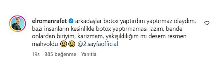 Rafet El Roman, "Arkadaşlar botoks yaptırdım, yaptırmaz olaydım! Karizmam mı, yakışıklılığım mı desem resmen mahvoldu." ifadelerini kullandı.Pop müziğinin ünlü sanatçılarından Rafet El Roman adıyla tanınan Rafet Yaşdut, son zamanlarda yüzündeki değişimlerle gündeme geldi. Roman'ın şiş görünen yüzüyle verdiği röportaj kısa sürede sosyal medyada gündem oldu.Rafet El Roman'a yönelik kullanıcılardan, "Çok sert ve ağır bir botoks yaptırmış gibi duruyor", "Çok kötü görünüyor", "Ne yaptın kendine?" gibi yorumlar geldi.Bu yorumların ardından sessizliğini bozan Rafet El Roman, yüzünün son haliyle ilgili açıklama yaptı.'YAKIŞIKLILIĞIM RESMEN MAHVOLDU'Botoks yaptırdığını itiraf eden şarkıcı, pişmanlığını şu sözlerle dile geitrdi:"Arkadaşlar botoks yaptırdım, yaptırmaz olaydım! Bazı insanların kesinlikle botoks yaptırmaması lazım. Ben de onlardan biriyim. Karizmam mı, yakışıklılığım mı desem resmen mahvoldu."