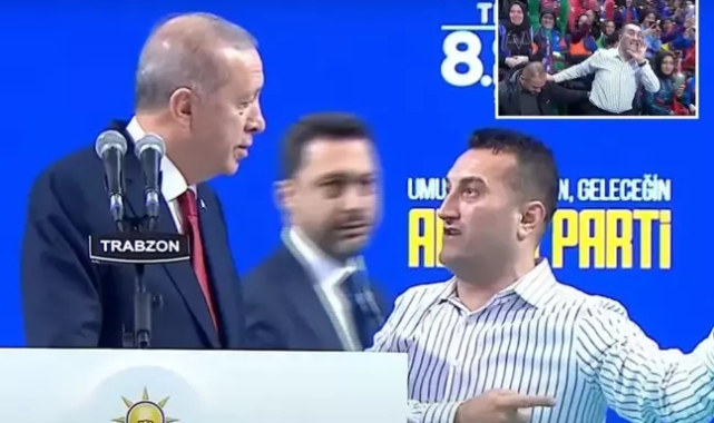 Bir vatandaş ısrarla sahneye çıkmak istedi. Cumhurbaşkanı Erdoğan, vatandaşın isteğini kırmadı. Sahneye çıkan vatandaş, Erdoğan'a yüksek sesle bir şeyler söyledikten sonra elini öptü.Erdoğan'ın açıklamalarından satır başları şu şekilde:"AK Parti kurulduğu günden beri hizmet siyaseti yapan bir parti olmuştur. Biz hep icraatlarıyız ile konuştuk, yatırımlarımız ile konuştuk. Biz görevlerimize gelirken millete efendilik etmeye değil hizmetkâr olmaya geliyoruz dedik. Trabzon'un emaneti bizdedir, emin ve ehil ellerde. Liyakatli kadrolar Trabzon'da iş başında. Trabzon'un emanetine leke bulaştırmayacağız. Çünkü biz Trabzon'u gönülden seviyoruz.Trabzon ülkemize yeri asla doldurulamayacak katkılar yaptı. Bölgenin ayağa kaldırılmasında Trabzonlu kardeşlerimiz önemli görevler aldı. Trabzon Türkiye Yüzyıl'ının öncü şehirlerinden olacaktır. Terörsüz Türkiye hedefimize el birliği içinde mutlaka ulaşacağız. Çok boyutlu, her adımı incelenmiş politika yürütüyoruz. Terörü kaynağında yok etme stratejisinde önemli başarılar elde ettik. PKK'nın uzantılarını sınır hattımızdan uzaklaştırdık."TERÖR ÖRGÜTÜ İÇİN YOLUN SONU GÖRÜNÜYOR"