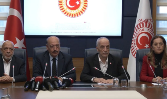 TÜRK-İŞ Genel Başkanı Ergün Atalay, DİSK Genel Başkanı Arzu Çerkezoğlu ve HAK-İŞ Genel Başkanı Mahmut Arslan, 'vergide adalet' talebiyle dün TBMM'de başlattıkları siyasi parti turlarını bugün tamamladı.Üç konfederasyonun genel başkanı siyasi partilerin grup başkanvekilleri, Plan ve Bütçe Komisyonu Başkanı Mehmet Muş ve Sağlık, Aile, Çalışma ve Sosyal İşler Komisyonu Başkanı Vedat Bilgin'i ziyaretinin ardından ortak açıklama yaptı.TÜRK-İŞ Genel Başkanı Ergün Atalay, şunları söyledi:*Son çeyrek asırdır görmediğimiz bir ekonomik sıkıntıyla karşı karşıyayız. Biz, taleplerimizi 130 gündür ülkenin değişik illerinde, grevlerle, mitinglerle, iş durdurmalarla bunları sürdürdük.*Bundan tam bir ay evvel Ankara Tandoğan Meydanı'nda 150 bin kişinin katıldığı büyük bir miting yaptık. Sorun neydi? Siz bu kış kıyamette Ankara'ya 150 bin kişi, daha önce hiçbir siyasi parti falan buraya toplayamazsınız.*Bizim vergiyle ilgili ana sıkıntılarımızdan bir tanesi; ocak ayında aldığımız ücreti aralık ayında almıyoruz. Geçmişte yüzde 15’ten başlayıp, yüzde 27’ye ancak aralık ayında geliyorduk.*Biz 12 ay çalışıyoruz, işçiler iki ayını vergiye veriyor. Bunun kabul edilir bir tarafı yok. Vergi dilimi, geçmişte asgari ücretin 17 katıydı. Şimdi baktığınız zaman beş katı oluyor. Bu eski düzenlemeye gelse bile problemi en azından bir bölümünü halletmiş olacağız.TAŞERONLAR, STAJ MAĞDURLARI, EMEKLİLER..."*Ülkedeki çalışanların bizden beklentisi şu. Sayın Bakanın bakanlık döneminde taşeronla ilgili vermiş olduğu bir söz vardı. Ardından deprem oldu. Taşeronların beklentisi var. Staj mağdurlarının bizden beklentisi var. Emeklilerin aldığı ücret ortada.*Onların bizden beklentisi var. Şu anda biz bugün burada bu basın toplantısını yaparken sabahleyin Çayırhan’da 500 maden işçisi kendini madene kapattı. Çayırhan, Nallıhan ve Beypazarı’nda öyle bir özelleştirme yapılıyor ki işçi yok, ailesi yok. Spor tesisleri, lojmanlar satılıyor.*Bununla ilgili bugüne kadar yetkililerin tamamıyla ben de görüştüm, yetkili sendikalarla görüşüp şu ana kadar müspet bir cevap alamadık. 4 Aralık'ta ihale var. Arkadaşlarımız sabahleyin kendilerini oraya kapattılar.*Arkadaşlarımız, müspet bir netice alana kadar oradan çıkmayacaklar. Maden işçisinin beklentisi var.*Kamu işçileri geçmişte ücretlerde öncüydü. Öyle bir noktaya geldi ki bu enflasyondan dolayı kamu işçileri asgari ücret düzeyine düştü. Kamu işçileri şu anda ortalama 30-35 bin lira civarında ücret alıyor.*Savunma sanayisinde, enerjide, ulaştırmada çalışan teknik elemanlar. Bu yetmiyormuş gibi bir emeklilik sistemi çıkardılar. 14 Ocak’a kadar emekli olmazsan yüzde 35 kaybın var.*Bu insanlar bir rakama göre 150 bin civarında, bir rakama göre 200 bin civarında. Bu arkadaşlarımız 40 yaşlarında. Bunu, ülkeyi yönetenlerin tamamını anlattık. Ama bugüne kadar bununla ilgili müspet bir cevap vermediler.*Bu ülkenin ekonomik politikası var ama sosyal politikası yok. Onun için bu ülkede sosyal politikaya ihtiyaç var.ASGARİ ÜCRET AÇIKLAMASI*Şu anda gündemde asgari ücret var. 40 senedir asgari ücret görüşmeleri devam ediyor. Bugüne kadar dört kere imzalanmış. 36 kere imzalanmamış. İki dönemdir Asgari Ücret Tespit Komisyonu’nun tamamı işçi oluyor. Onlar geçen dönem bize gelip ‘18 bin lira olsun, yılda 2 defa olsun’ dediler.*Biz de ülkeyi yönetenlerin önüne koyduk. ‘18 bin lira olsun. Yılda iki kere olsun’ dedik. Bugüne kadar müspet bir çalışma yapılmadı. Mitingde biz asgari ücretliye, taşerona, emekliye söz verdik.*Asgari ücret öyle bir noktaya geldi ki başta IMF olmak üzere uluslararası örgütler, sermaye kuruluşları bugüne kadar birçok kişi, kurum, tutar ve artış oranı açıklıyor. Burada bir algı operasyonu yürütülmekte. Enflasyonla mücadele için düşük asgari ücret gerekliliği savunulmakta. Bir rakam açıklamak yerine tespit yapılırken temel alınması gereken ilke şu.*Bir işçinin ailesiyle günün ekonomik, sosyal şartlarına göre insanca yaşamasını mümkün kılacak insanlık onuruyla bağdaşacak bir düzeyde asgari ücret tespit edilmeli. Bunu biz de savunuyoruz. Bunu bizim dışımızdaki sendikalar da savunuyor.*Ekonomik politika devam ederken sosyal politikayı görmemezlikten gelemezsiniz. Bizi yok saymasınlar. Biz bu ülkede çalışanlar şu anda zordayız. Geçinemiyoruz. Geçinmekle ilgili sıkıntımız var. Aynı sıkıntı emeklide de var.ÇERKEZOĞLU: BÜYÜKADALETSİZLİK VAR*Türkiye'de işçiler ve emekçiler, ücretiyle geçinenler, emekliler, kadınlar, gençler çok ciddi bir geçim sıkıntısıyla karşı karşıya. Yüksek enflasyon, işsizlik, enflasyon karşısında alım gücümüzün her gün daha da fazla azaldığı bir süreci yaşıyoruz. Hepimizin yaşadığı bu yoksullaşma,*Türkiye yoksullaştığı için gerçekleşmiyor. Türkiye'deki temel mesele bir bölüşüm meselesidir. Hepimiz çalışıyoruz, üretiyoruz ancak ürettiğimiz değerin paylaşımında, bölüşümünde büyük bir adaletsizlik var. *Bu yaşadıklarımızın hiçbirini konuşmamamız gereken bir ülkede yaşıyoruz bizler. Bu kadar olağanüstü bir coğrafyada, yeraltı-yer üstü kaynaklarımızın son derece zengin olduğu, hepimizin çalışarak ürettiği toplam değerin 85 milyon insanı insanca yaşatmaya yeter de artar olduğu bir ülkede, biz aslında bütün bunları konuşmamak durumundayken bugün ülkeyi yöneten iktidarın politikaları nedeniyle bunu yaşıyoruz.*Yaşadığımız bu işsizlik, yoksulluk, hayat pahalılığı, hepimizin yoksullaşması kendiliğinden ortaya çıkan ya da basit bir beceriksizlik nedeniyle değil ülkeyi yöneten siyasi iktidarın tercihleri sonucunda ortaya çıkıyor. Teme