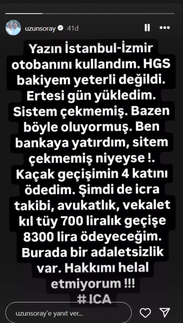 Sosyal medya hesabından konuya ilişkin bir paylaşım yapan Uzun, "Yazın İstanbul- İzmir otobanını kullandım. HGS bakiyem yeterli değildi. Ertesi gün yükledim. Sistem çekmemiş. Bazen böyle oluyormuş. Ben bankaya yatırdım, sistem çekmemiş niyeyse! Kaçak geçişimin 4 katını ödedim. Şimdi de icra takibi, avukatlık, vekalet kıl tüy 700 liralık geçişe 8300 lira ödeyeceğim. Burada bir adaletsizlik var. Hakkımı helal etmiyorum" ifadelerine yer verdi.İşte Şoray Uzun'un o paylaşımı;