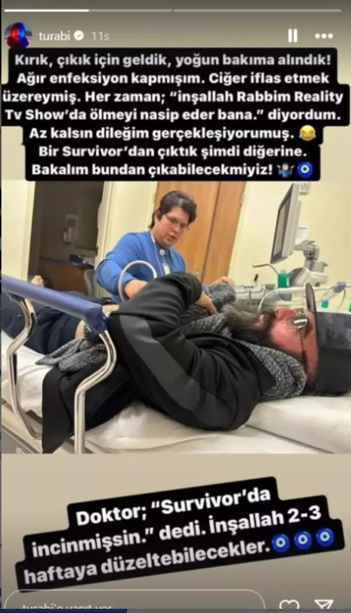 Hastane odasında çekilen bir fotoğrafını paylaşan Turabi, 'Kırık çıkık için geldik, yoğun bakıma alındık' ifadelerini kullandı. Fenomen yarışmacının paylaşımı takipçilerini endişelendirdi.Turabi paylaşımının devamında ise 'Ağır enfeksiyon kapmışım. Ciğer iflas etmek üzereymiş. Bir Survivor'dan çıktık şimdi diğerine" notunu düştü.Turabi'nin paylaşımı şöyle"Her zaman 'İnşallah Rabbim reality TV show'da ölmeyi nasip eder bana' diyordum. Az kalsın dileğim gerçekleşiyormuş. Bir Survivor'dan çıktık, şimdi diğerine. Bakalım bundan çıkabilecek miyiz? Doktor 'Survivor'da incinmişsin' dedi. İnşallah 2-3 haftaya düzeltecekler"