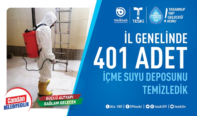 Tekirdağ Büyükşehir Belediyesi'ne bağlı Tekirdağ Su ve Kanalizasyon İdaresi Genel Müdürlüğü (TESKİ), vatandaşlara sağlıklı ve kesintisiz su sağlama amacıyla 7/24 çalışmalarını sürdürüyor. Bu kapsamda, il genelindeki içme suyu depolarının düzenli olarak temizlik ve dezenfeksiyon işlemleri yapılıyor.TESKİ Genel Müdürü Mehmet Ali Şişmanlar, sağlıklı su temini konusunda hassas olduklarını vurgulayarak, su kalitesinin düzenli analizlerle kontrol altında tutulduğunu belirtti. Şişmanlar, "Halkımızın kullandığı suyun kalitesini sürekli denetliyoruz. Numuneler alıp analizler yapıyoruz.Ayrıca tüm depolarımızda bakım, onarım ve tadilat çalışmalarımızı sürdürüyoruz. Bu kapsamda, 11 ilçede toplamda 203.091 m³ hacmindeki 401 adet içme suyu deposunda dezenfeksiyon, temizlik ve tadilat çalışmaları tamamlanmış durumda" dedi.TESKİ Genel Müdürü, depolardaki temizlik ve dezenfeksiyon çalışmalarının devam ettiğini belirterek, "Suyun içme ve kullanma suyu olarak kullanılabilirliği büyük önem taşıyor. Depolardaki temizlik ve hijyen çalışmalarımızı yoğun bir şekilde il genelinde sürdürüyoruz" diye ekledi.Tekirdağ Büyükşehir Belediyesi, suyun kalitesini artırma çalışmalarıyla vatandaşların sağlığı için önemli adımlar atmaya devam ediyor.