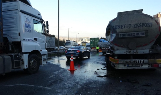 Kocaeli İzmit'te 3 aracın birbirine girdiği faciada 5 kişi yaralandı.Olay saat 16.00 sıralarında TEM otoyolu İzmir geçişinde meydana geldi. Ankara yönüne giderken arızalanan 01 ANK 900 plakalı tanker, sürücüsü tarafından durduruldu.Bu esnada arkadan gelen TIR, kontrolünü kaybederek tankere çarptı. Tankere çıktıktan sonra da durmayan TIR ceza infaz kurumuna ait bir minibüse de çarpınca facia ortaya çıktı.Bölgeye jandarma, itfaiye ve acil sağlık ekipleri geldi. İtfaiye ekipleri, ceza infaz kurumuna ait minibüs içerisinde sıkışanları kurtardı. Yaralanan 4 jandarma personeli ile 1 mahkum ambulanslarla çevredeki hastanelere kaldırıldı. Yara almayan 1 mahkum da jandarma ekipleri tarafından karakola götürüldü.