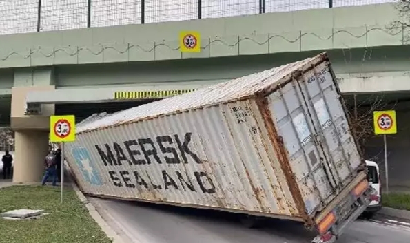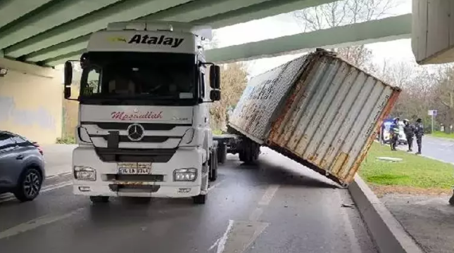 Bakırköy'de TIR'ın taşıdığı konteyner üst geçide çarptı. Konteyner yola devrilirken kaza nedeniyle trafik tek şeritten kontrollü olarak sağlandı.