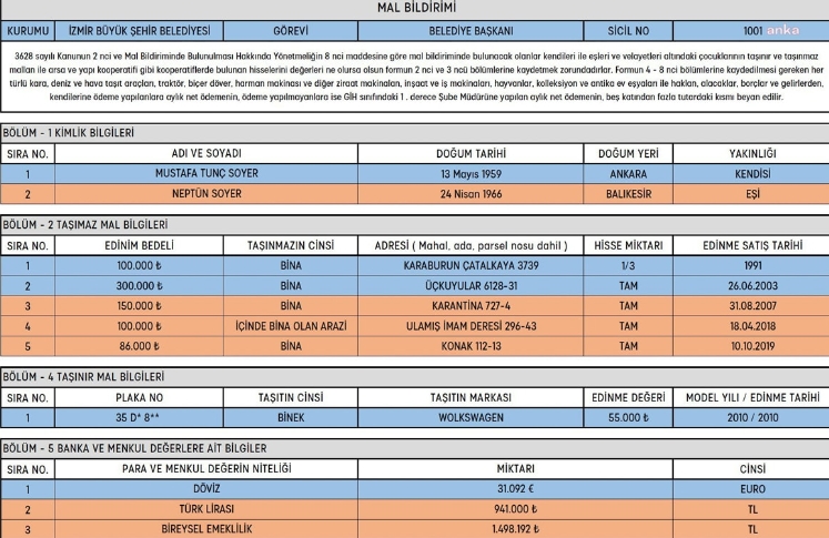 İzmir Büyükşehir Belediye Başkanı Tunç Soyer, sosyal medya hesabından, "Mal varlığı beyanım. Kamuoyuna saygılarımla" notuyla kendisi ve eşi Neptün Soyer'e ait mal varlığını açıkladı.Tunç Soyer'e ait mal varlığı: