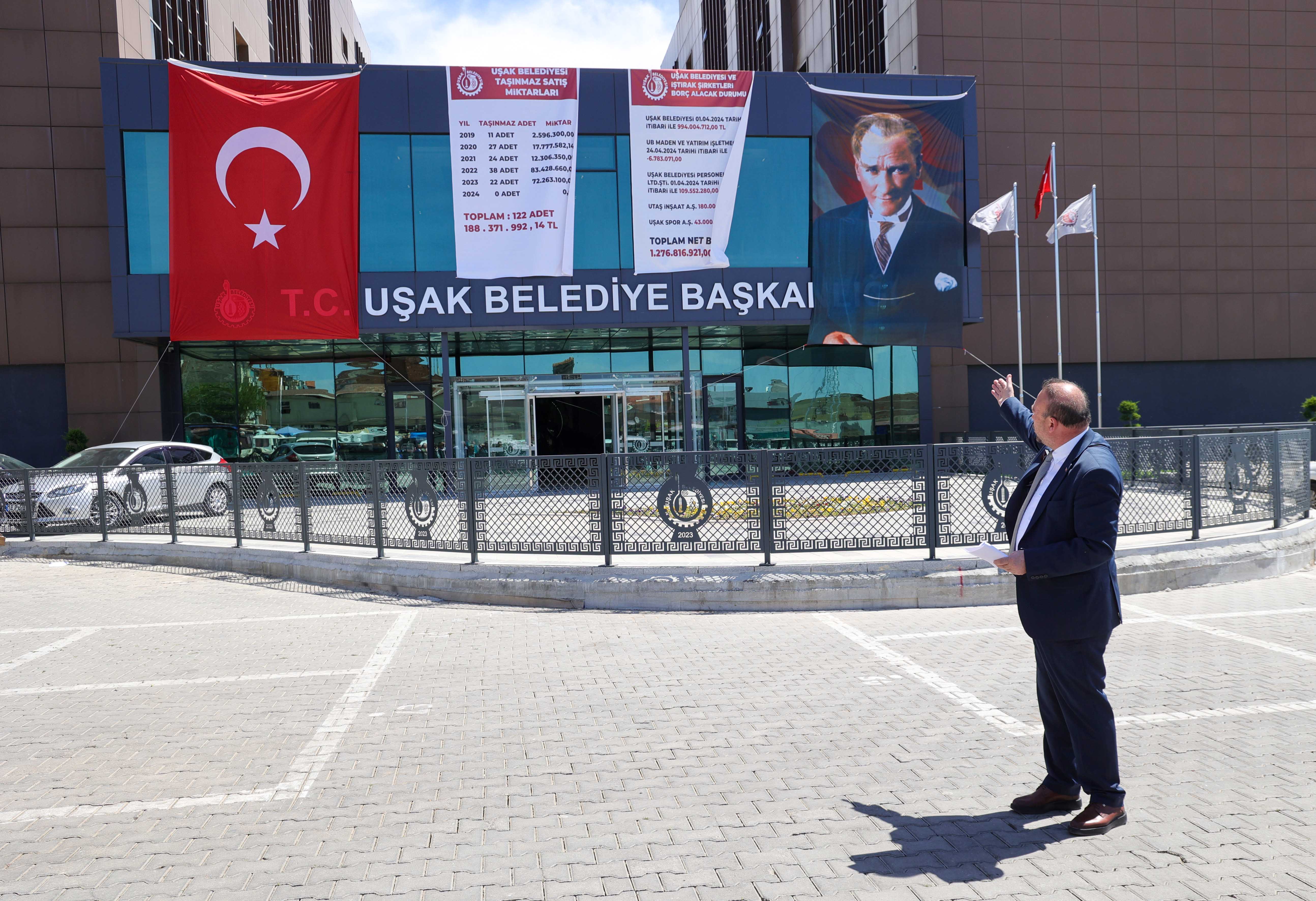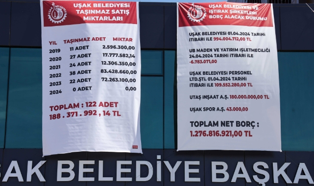 31 Mart yerel seçimlerinde rekor farkla başkanlığı kazanan ve AK Parti yönetiminden koltuğu devralan CHP’li Belediye Başkanı Özkan Yalım; belediye binasına astırdığı afişle Uşak Belediyesi’nin borçlarını açıkladı.Buna göre Uşak Belediyesi’nin eski dönemden kalan toplam 1 milyar 276 milyon 816 bin 921 TL borcu bulunuyor. Borçların bir kısmı Uşak Belediyesi’ne aitken bir kısmının belediye iştiraklerine ait olduğu görülüyor.“DEVRALDIĞIMIZ BORÇ YAKLAŞIK 1.3 MİLYAR TL”Mali konularla ilgili ekibin çalışmalarını tamamladığını ve net listenin kendilerine ulaştığını söyleyen Başkan Özkan Yalım; mevcut borçların listesini asarak tüm Uşak halkına şeffaf bir şekilde sunduklarını dile getirdi. Adeta bir enkaz devraldıklarının altını çizen Başkan Yalım, bunun kendilerini yıldırmayacağını ve durumu en kısa sürede toparlayarak hizmet etmekten vazgeçmeyeceklerini vurguladı.Başkan Yalım; “Yaptığımız araştırmaya göre Uşak Belediyesinin 01.04.2024 tarihi itibariyle 994.004.712,00 TL, UB Maden ve Yatırım İşletmeciliği’nin 24.04.2024 tarihi itibariyle 6.783.071,00 TL, Uşak Belediyesi Personel Limitet Şirketinin 01.04.2024 tarihi itibariyle 109.552.280,00 TL, UTAŞ İnşaat Anonim Şirketinin 180.000.000,00 TL ve Uşak Spor Anonim Şirketinin 43.000,00 TL borcu bulunuyor.Toplamda 1 milyar 276 milyon 816 bin 921 lira olan bu borç maalesef Uşak halkının sırtına yüklenmiş bir yüktür ve biz var gücümüzle üretimi ve gelirlerimizi artırarak bu durumu düzelteceğiz” dedi.ŞEFFAF VE HALKÇI YAKLAŞIM GELDİYoğun bir tempodan çıktıklarını ve tüm borçlara rağmen yoğun bir şekilde belediyedeki çalışmaların devam ettiğini söyleyen Başkan Yalım; “Vatandaşın belediye başkanına temas etmesi konusunda yıllardır büyük bir sıkıntı vardı.Biz belediye başkanlığı makamının kapısını vatandaşa açtık. Vatandaşımız hem bizimle temas edip istişare edebiliyor, hem de her türlü konuyu konuşup danışabiliyor. Bundan sonra da bu böyle devam edecek.Vatandaşlarımız artık belediyemizin ekonomik durumunu da öğrenmiş oldu” diye konuştu.Öte yandan vatandaşların ve basın mensuplarının görebilmesi için belediyenin binasına asılan büyük afiş birçok kişinin ilgi odağı oldu. Özellikle belediye çevresinde bulunan vatandaşlar merakla afişi incelerken, birçok kişinin fotoğraf çekmesi de dikkatlerden kaçmadı.