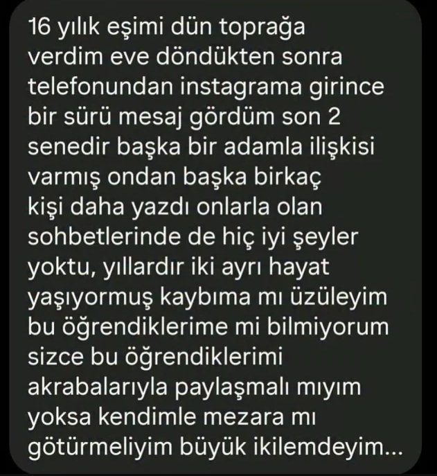 Sosyal medyada "itiraf" içerikli bir paylaşımda, 16 yıllık eşini toprağa verdikten sonra eve döndüğünde eşinin telefonundan Instagram'a girdiğini ve karşılaştığı mesajlar nedeniyle şoke olduğunu anlatan bir kişinin ifadeleri kısa sürede gündem oldu.CİDDİ BİR İKİLEM YAŞIYORPaylaşımı yapan kişi, eşinin hesabındaki mesajları gördüğünü, son iki yıldır başka biriyle ilişkisi olduğunu öğrendiğini öne sürdü. Aynı paylaşımda, yaşadığı duygu karmaşasını dile getiren kişi "kayıbıma mı üzüleyim, öğrendiklerime mi" sözleriyle yaşadığı ikilemi anlattı."AKRABALARIYLA PAYLAŞMALI MIYIM?" DİYE SORDUGönderide, öğrendiği iddia edilen mesajları eşinin akrabalarıyla paylaşıp paylaşmaması gerektiğini de sorgulayan kişi, yaşadığı şoku ve kararsızlığı sosyal medya kullanıcıları ile paylaştı.İşte o paylaşım;YORUMLAR İKİYE BÖLÜNDÜPaylaşımın altına kısa sürede çok sayıda yorum geldi. Bazı kullanıcılar "Bence okumamış ol" derken, bazıları "Ölene kadar hiç mi bakmadın abi telefonuna?" yorumunu yaptı. Bir başka kesim ise "Ölenin arkasından konuşulmaz, büyüklük sende kalsın" diyerek paylaşımı eleştirdi.Kaynak: Haberlercom
