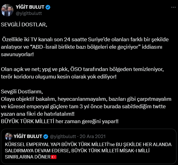 Bulut, sosyal medya hesabından yaptığı paylaşımda şunları kaydetti: "Sevgili dostlar, özellikle iki TV kanalı son 24 saatte Suriye'de olanları farklı bir şekilde anlatıyor ve 'ABD-İsrail birlikte bazı bölgeleri ele geçiriyor' iddiasını savunuyorlar!Olan açık ve net; YPG ve PKK, ÖSO tarafından bölgeden temizleniyor, terör koridoru oluşumu kesin olarak yok ediliyor!Sevgili dostlarım, olaya objektif bakalım, heyecanlanmayalım, bazıları gibi çarpıtmayalım ve küresel emperyal güçlere tam 3 yıl önce burada sabitlediğim twitte yazan ana fikri de hatırlatalım!! Büyük Türk Milleti her zaman gereğini yapar!" Kaynak:Haberler.com